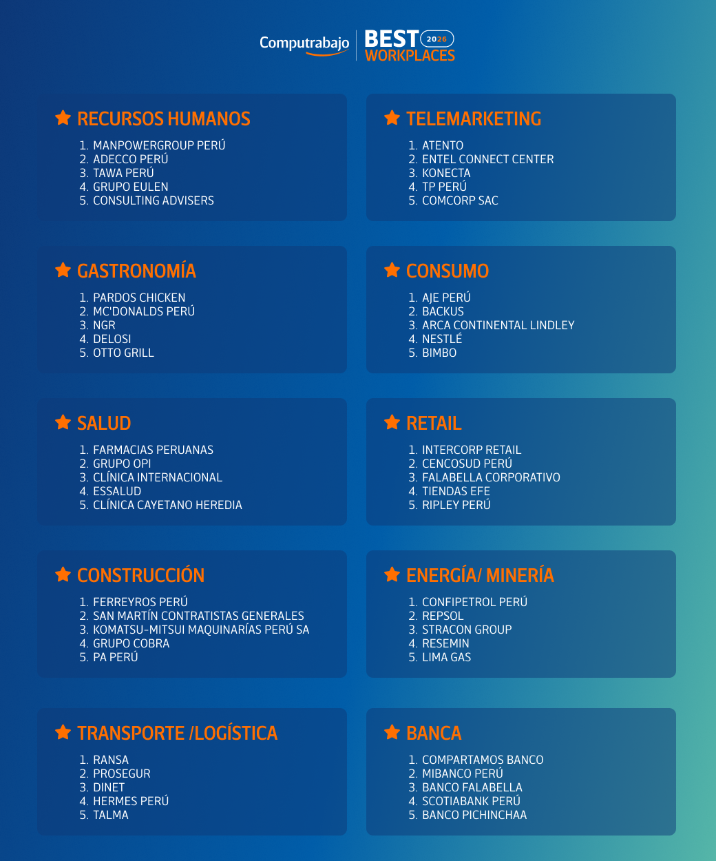 El ranking también presenta a los cinco primeros puestos de cada sector empresarial presente en esta novena edición. Entre los rubros evaluados se encuentran Recursos Humanos, Telemarketing, Gastronomía, Consumo, Salud, Retail, Construcción, Energía/Minería, Transporte/Logística y Banca. Esta segmentación permite identificar las mejores prácticas de gestión de talento humano de acuerdo con la naturaleza de cada industria.